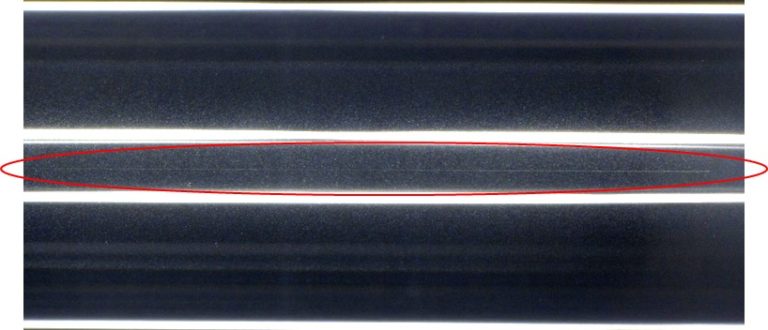 The above image is an example of an axial scratch that spans the length of the viewing field. This type of scratch can enable a direct leak path from the high pressure side to the low pressure side of the seal.